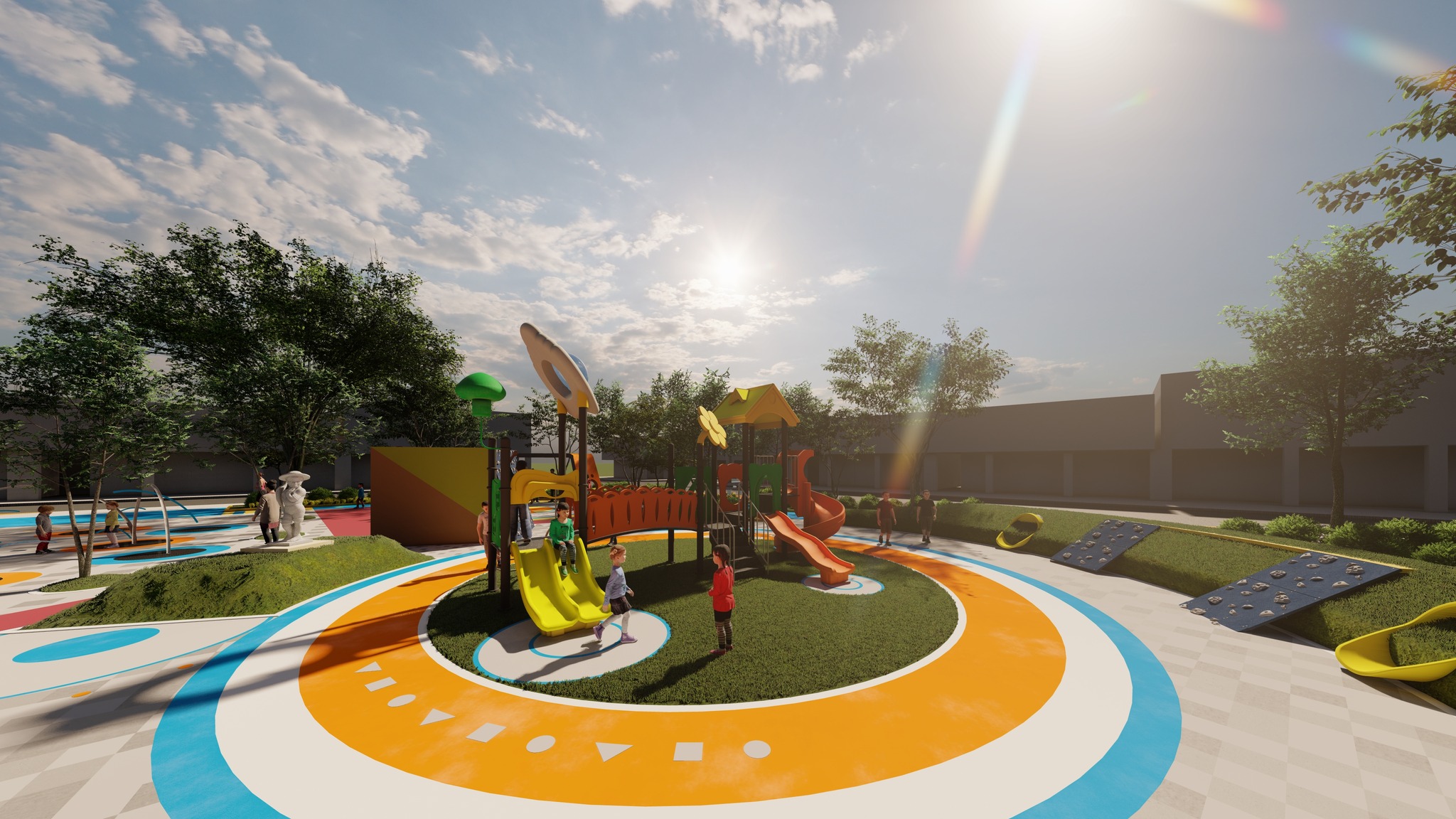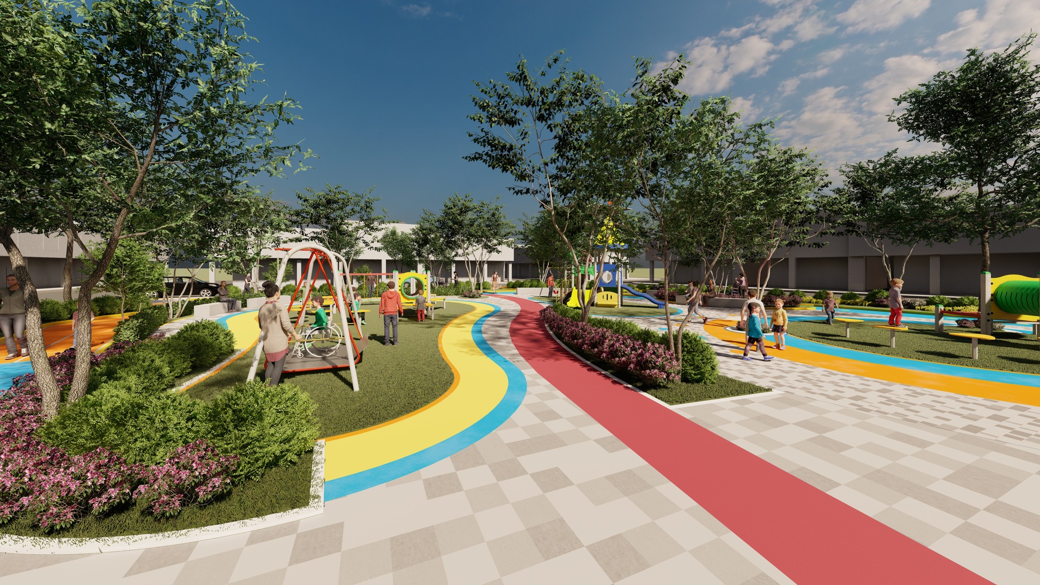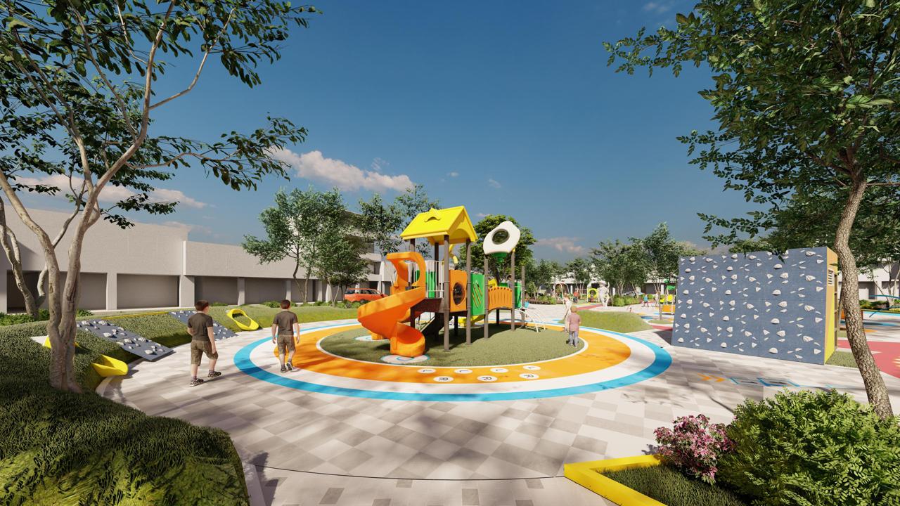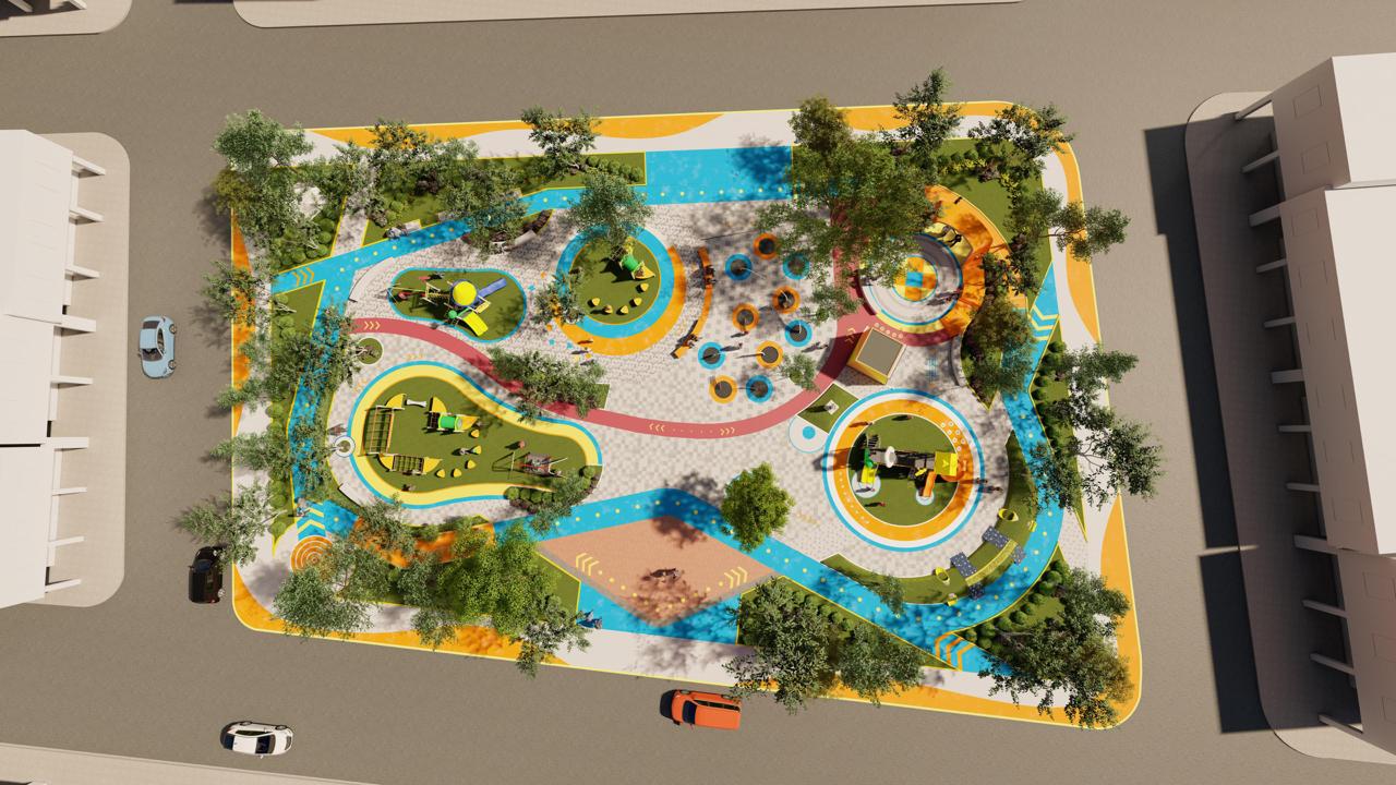 La obra contempla un diseño vanguardista y contemporáneo con la construcción de camineras, zonas verdes, juegos infantiles lúdicos, piletas secas, iluminación y más.